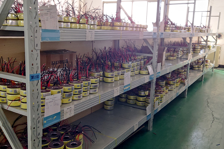 圣元變壓器的貨架上存放著已檢測好的環(huán)形變壓器,以供客戶急需。